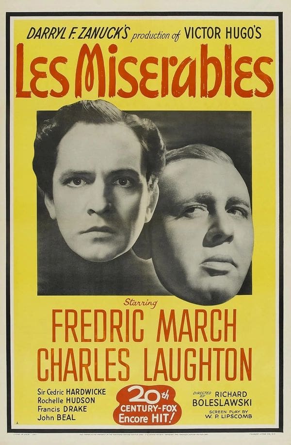 THIS MOVIE FEATURES JEAN VALJEAN, A FRENCHMAN, WHO IS PURSUED BY A BRUTAL LAWMAN, JAVERT, AFTER HE IS CONVICTED OF STEALING A LOAF OF BREAD. STARRING CHARLES LAUGHTON, FREDRIC MARCH, CEDRIC HARDWICKE, ROCHELLE HUDSON, FRANCES DRAKE, FLORENCE ELDRIDGE.
